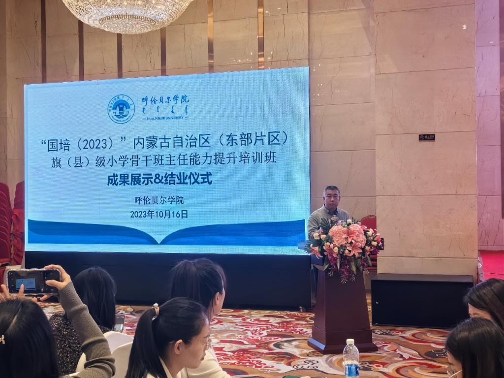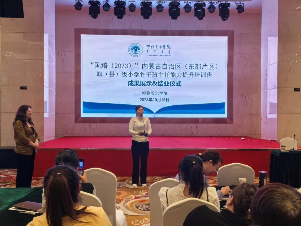 2023年10月16日,“国培(2023)”内蒙古自治区(东部片区)旗(县)级小学骨干班主任能力提升培训班结业仪式在天益华辰酒店二楼会议室举行。海拉尔区教育研修中心副主任毕秀芝主持,并与来自内蒙古自治区东部地区旗县小学骨干教师190余人共同见证并分享了他们在本次培训中取得的成果。