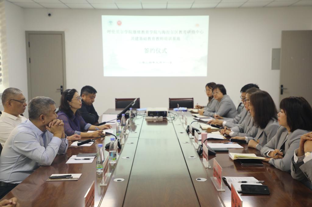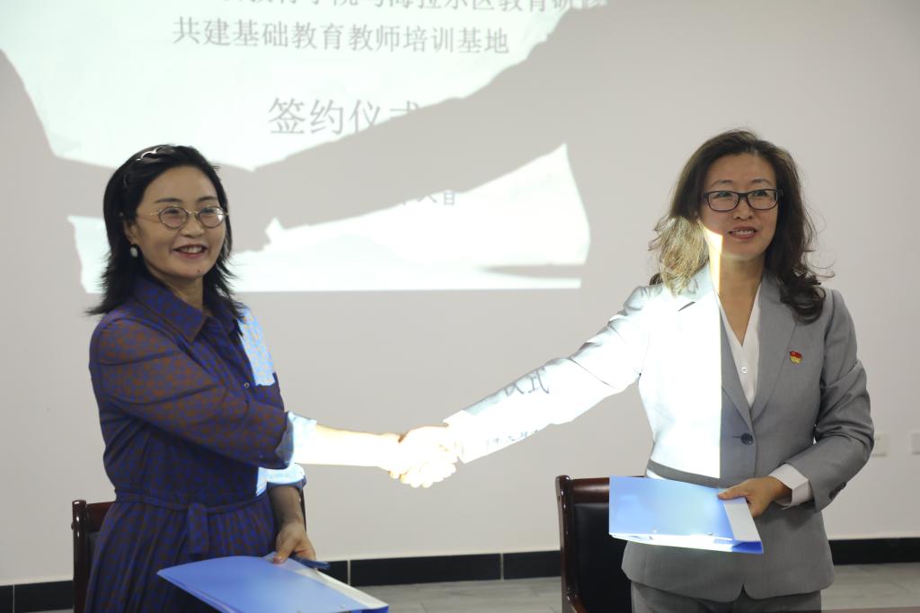9月18日下午,bevictor1946韦德官网与海拉尔区教育研修中心共建基础教育教师培训基地合作协议签约仪式在海拉尔区教师研修中心二楼会议室举行。继续教育公司党总支书记李健、经理莎茹莉及班子成员,海拉尔区教育研修中心主任胡慧婷及班子成员、各科室负责人参加了签约仪式。